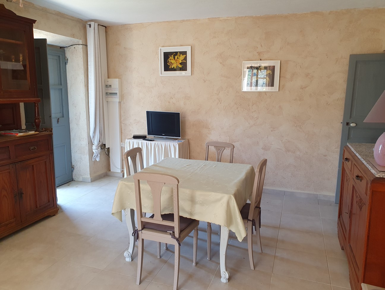 Le gîte comprend une chambre, une salle d'eau, une cuisine et une grande salle où se trouve un canapé-lit.